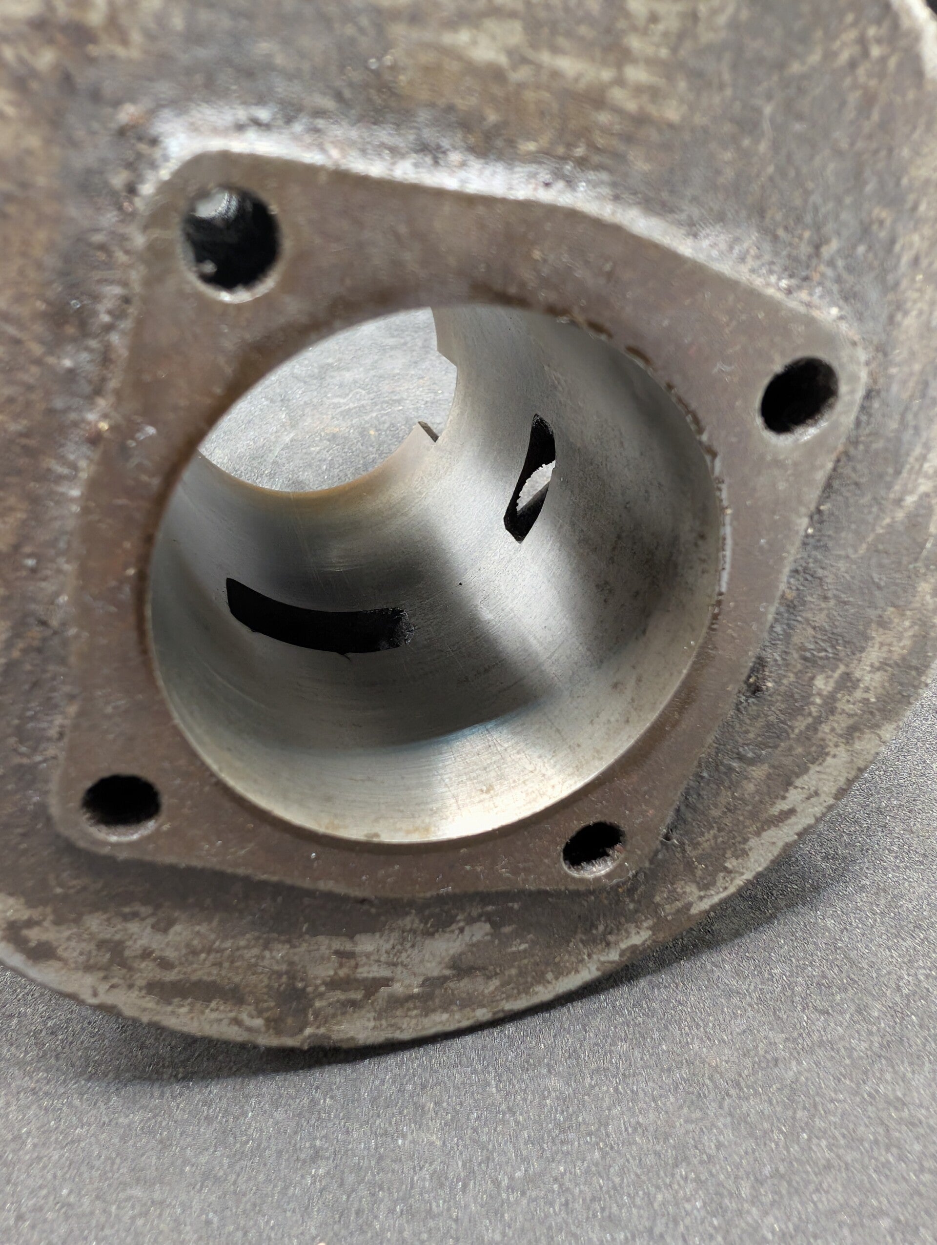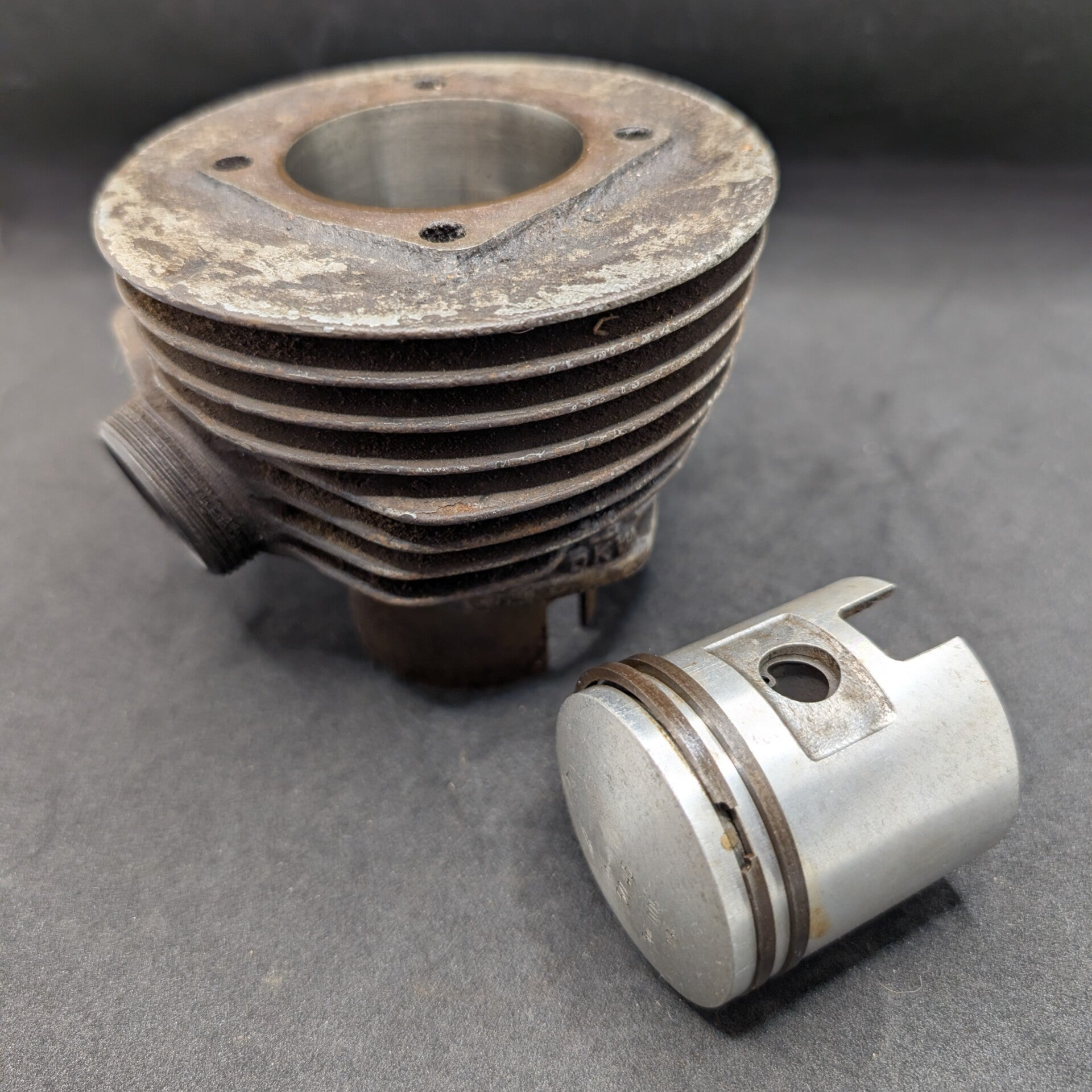 Honed cylinder + new piston set for DKW RT 100 (3HP). This is a very nice set with a new (old stock) piston. 1937-1939.