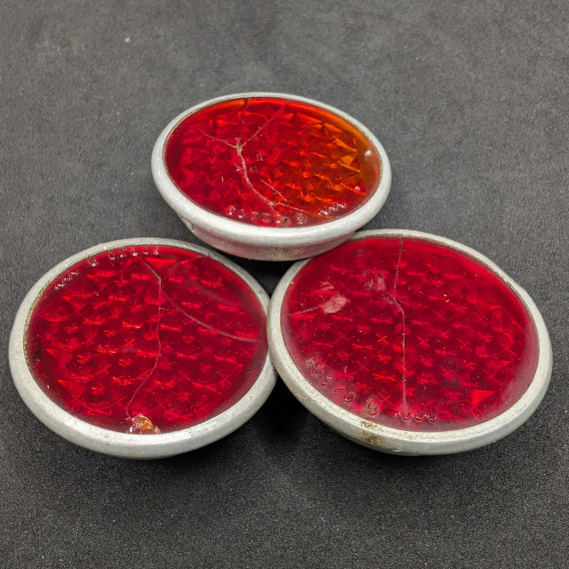 Reflektor für die DKW RT 100. Er ist unter dem Kennzeichenhalter montiert. Alle drei haben den gleichen Riss, das Glas fällt aber nicht heraus. Der Preis gilt pro Stück.